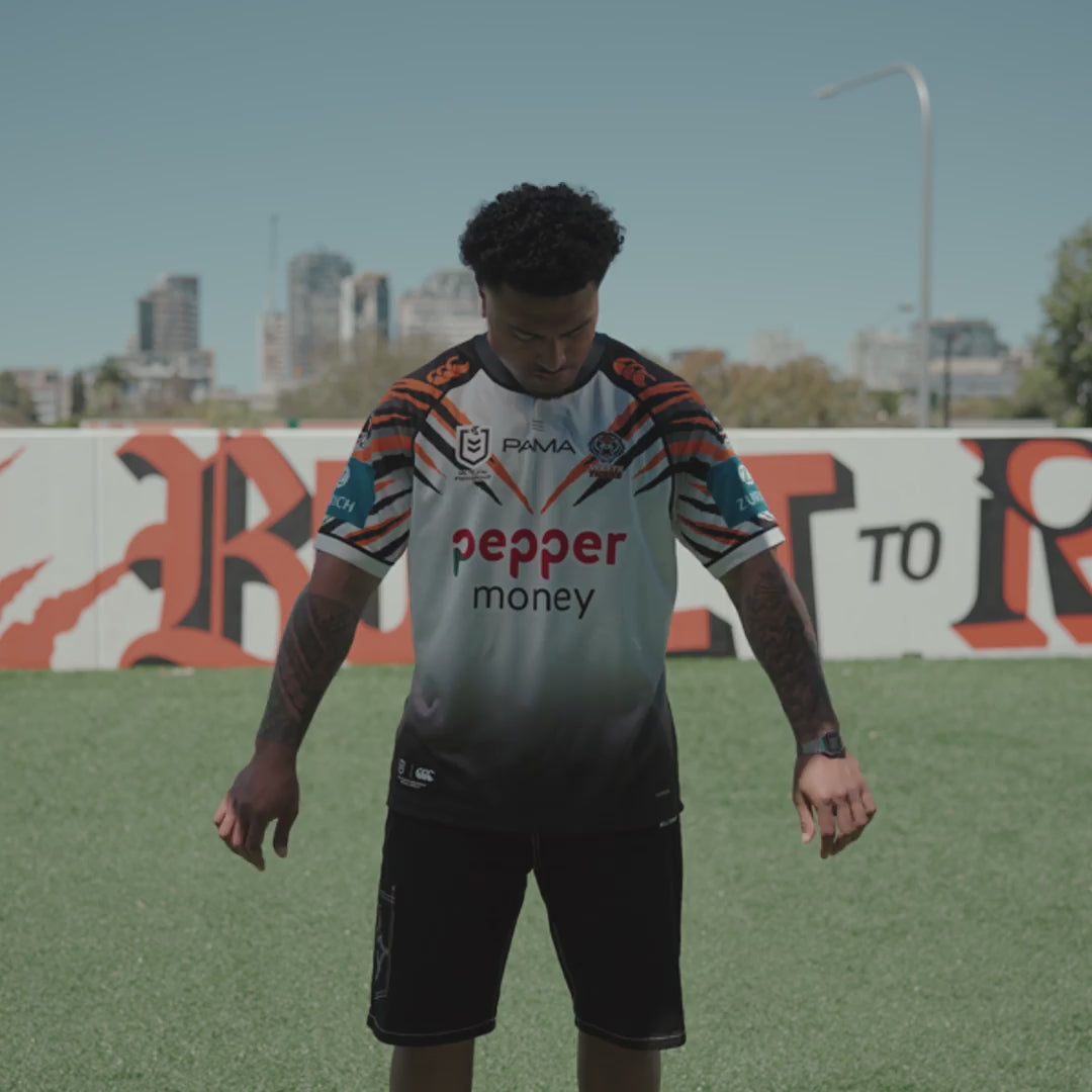 Built to Rise. The Wests Tigers 2026 Mens Away Jersey symbolises passion, commitment and performance, featuring a dynamic Tiger fur inspired design in white with striking Tiger striped chevron detailing. Showcasing Wests Tigers new direction…from endangered to dangerous.